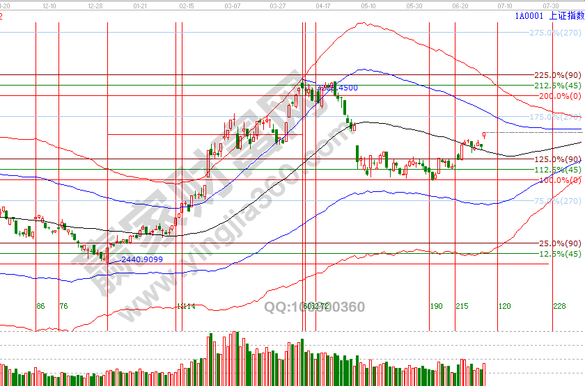 2840點(diǎn)一直是5、6月份贏家江恩大勢分析中強(qiáng)調(diào)的位置,同時江恩輪中輪時空分析一直未改變的觀點(diǎn)是60度2847點(diǎn)不破,按循環(huán)空間可以看到3051點(diǎn),指數(shù)已接近此點(diǎn)位,月線黑色生命線是3067點(diǎn),3051-3067所構(gòu)建的區(qū)間從工具判斷不在適合大舉開新倉,指數(shù)上攻超200點(diǎn),按買在支撐賣在壓力原則,指數(shù)未來越上攻應(yīng)以分批獲利兌現(xiàn)為主,3051-3067區(qū)間過后是日線藍(lán)色上軌線反壓。7月2號盤中壓力是135度3055點(diǎn)、180度3067點(diǎn),盤中支撐是90度3036點(diǎn)、45度3016點(diǎn),7月時間窗口是3(4)、15、23(24)號;操作策略,指數(shù)極反通道生命線上安全區(qū)域震蕩,反彈動作還在延續(xù),3051-3067區(qū)間附近高倉位可以分批兌現(xiàn)利潤,整體持倉保持3-5成。