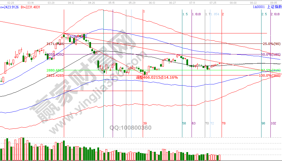 從江恩時間周期角度分析,市場又到了一個日線方向選擇區(qū),回顧近幾個月指數(shù)時間窗口(3月7號、4月8號、5月17號、6月5號、27號、7月3、15、23號),市場的重要級別、次要級別的時間拐點都是提前做出測算并公布,今天收盤后贏家江恩技術(shù)團(tuán)隊將借助工具分享8月時間窗口,目前公布的第一個是1號(黃金時間周期0.618);價格方面,江恩價格百分比延伸線2倍零度位2966點與240度2878點,是自8號后強(qiáng)調(diào)的具有操作條件的兩個位置,15、23號分別觸及2878點后回升,昨天是上攻至2966點(最高2965相差一個點)回落,結(jié)合趨勢,時間、價格三者綜合判斷,本周后半周持有倉的投資者要關(guān)注好盤面動向,并做好應(yīng)對計劃策略,7月31號盤中壓力是270度2961點、315度2978點,盤中支撐是180度2928點、225度2944點。操作策略,指數(shù)極反通道生命線震蕩,指數(shù)失守60分鐘生命線則反彈信號結(jié)束,向上則關(guān)注60分鐘藍(lán)色上軌線也有望形成反彈結(jié)束信號,投資者保持3成。