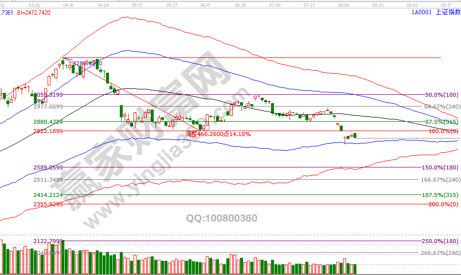 9號大盤最高點2808點(測算反壓2808一點不差),最低點2770點(測算支撐2772,僅相差2點),20年來贏家江恩大勢分析均是通過系統(tǒng)工具規(guī)則提前測算,歷史上重要時間、價格拐點都做有判斷,預判未來市場最有效的方法就是研究歷史。再談行情,下跌趨勢已確認,這在月初已闡述過,未來市場重要的時間參考點是9月、空間位置是月線藍色下軌線(學員通過極反通道工具獲取位置),這個觀點是7月中下旬公開課中有講過,當前這里定性的是反抽(級別很小,反彈都稱不上),保持6號觀點空間上看2744-2822,時間上9、16號,8號分析中談到價格需要等待時間,本周需要觀察等待期是以時間換取還是空間換取,因為級別太小,信號持續(xù)度隨之減弱,周初繼續(xù)觀察日線藍色下軌線支撐。8月12號盤中壓力是180度2800點、135度2786點,盤中支撐是45度2757點、0度2743點,日線時間窗口是16號。操作策略,指數(shù)生命線下弱勢區(qū)域運行,藍色下軌線震蕩,激進者最多3成倉交易,穩(wěn)健者空倉休息。