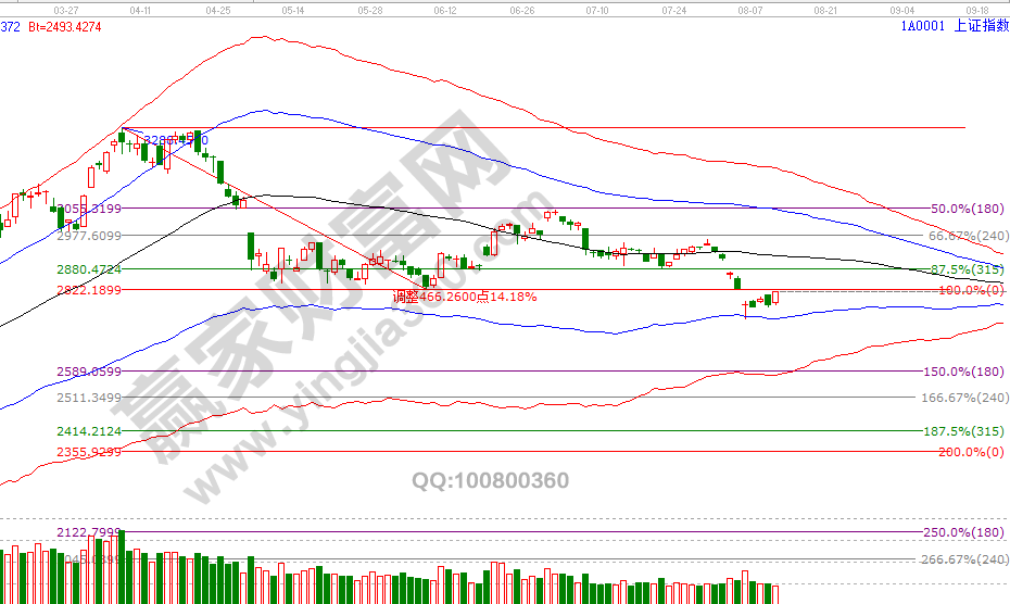 指數自6號觸及極反通道藍色下軌線2744點獲得支撐后展開反抽已有5個交易日,按時價等倍關系測算空間運行不足一半,從這一點說明市場反抽力量之弱。短周期15分鐘藍色上軌線是2823點(缺口位置是2822點),指數越向上運行遇到反壓級別越大,日線波段百分比延伸線180度是2834點,這也是6號測算的2744點、2834點兩個關鍵位,反抽時間還沒有結束,震蕩不改反抽目標位。8月13號盤中壓力是270度2829點,盤中支撐是180度2800點、2791點,日線時間窗口是16號。操作策略,指數生命線下弱勢區(qū)運行,激進者3成倉交易,穩(wěn)健者空倉休息。