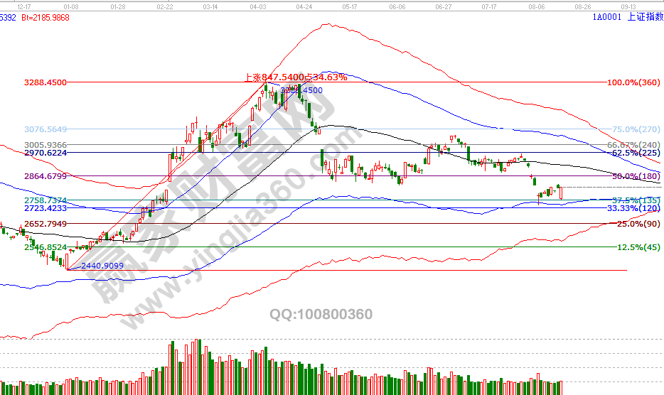 先回顧下近期預(yù)判,6號指數(shù)觸及日線極反通道藍色下軌線2744點定性反抽開始,并測算時間指向16號,空間指向百分比延伸180度2834點(14號最高點2829點)。16號是8月日線級別時間窗口,趨勢方面明天指數(shù)將確認一重要關(guān)鍵線,影響著下一個時間周期的走勢。13、14號分析中談到的一次價格快速波動期是連續(xù)的,按歷史規(guī)律15分鐘再度失守生命線指數(shù)將直逼6號低點。激進者剩余最后一批倉以百分比延伸線120度2791點得失做決策。8月16號盤中壓力是225度2815點、270度2829點,盤中支撐是135度2786點、90度2772點。操作策略,指數(shù)生命線下弱勢區(qū)運行,激進者3成倉以內(nèi)交易,穩(wěn)健者空倉休息。