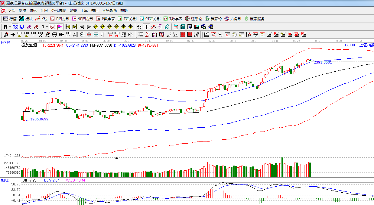 江恩看盤綜述:依據(jù)贏家江恩技術(shù)工具分析得出:今日指數(shù)圍繞外軌線震蕩,終盤以陰十字星報收,近期指數(shù)高位滯漲以及盤中震蕩加劇,而且macd有高位背離的走勢,,下周重點關(guān)注日線藍(lán)色外軌線的得失,此位置如破位,預(yù)計市場會出現(xiàn)幾天的日線級別調(diào)整,但以中線而言,短線的調(diào)整并不改變反彈趨勢,目前操作策略上做好倉位的調(diào)整保持3-5成左右。