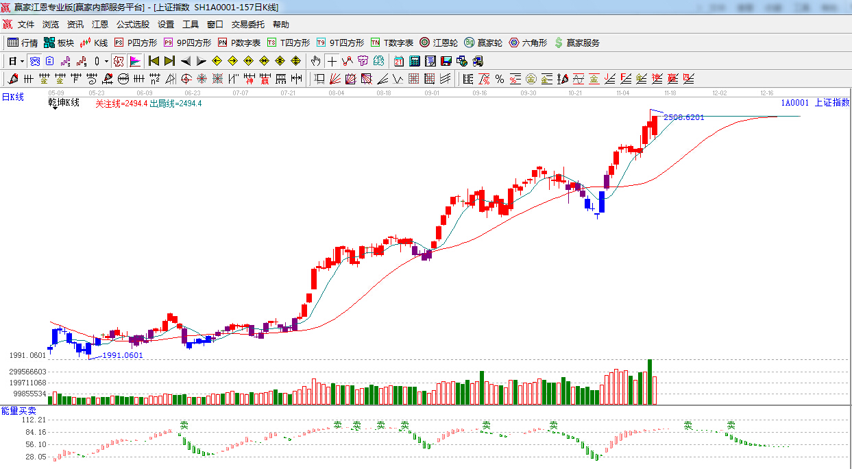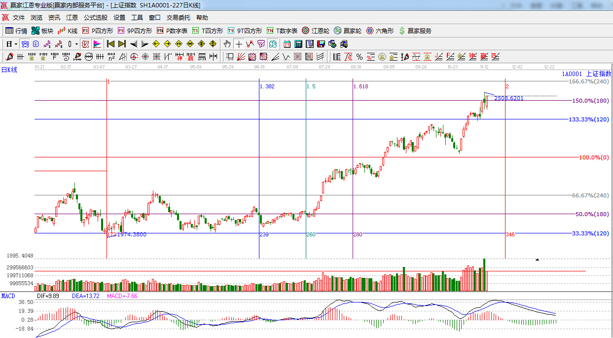 江恩看盤綜述:依據(jù)贏家江恩技術(shù)工具分析得出:上證指數(shù)低開高走,以中陽線報(bào)收,收復(fù)江恩180度2480點(diǎn),但量能較昨日大幅減少,后期若無量能跟隨,短期維持在2500點(diǎn)附近形成強(qiáng)勢震蕩行情難以避免,短線依然留意180度2480點(diǎn)的得失,本月重要時(shí)間窗口在11月24日。