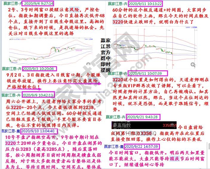 2020年一季度大盤反復摔打創(chuàng)年內(nèi)低點2646點、二季度小碎步攀升、三季度強勢上攻隨后轉入修整,四季度行情拉開序幕、蓄勢待發(fā)。8、9月份市場在箱體區(qū)間內(nèi)運行,贏家江恩團隊在正式學員群提前給出箱體策略,原話如下“在一個箱體區(qū)間里做滾動交易--底倉+活動倉,不會輕易的去追漲,而是對持續(xù)跟蹤的標的(日或周強勢區(qū)域)調整幾天后用活動倉參于,上漲到別人想追時賣出?!?/span>學員可在群中搜索“箱體”回顧提出時間進行思考,為何能提前于市場走勢之前就提出相應的策略?當你你又是如何打算的呢?后知后覺者永遠是賣單者,大家看看自己的賬戶,是不是9月份把今年賺的都還給市場了,其中應該不少人8月份就還了利潤,9月份還虧了本金。如這樣都不能讓你明白,擁有一套“投資體系”的重要性,那再來一波牛市,賺的錢最終也不是你的。如果你跟隨專業(yè)的團隊進行學習,在9月初2號、3號時間窗口,提醒降低倉位時控制倉位,不僅保住了利潤還可以根據(jù)工具信號在9月11日3220時價點做一個反彈,同樣贏家江恩團隊提前測算出3350壓力,9月底指數(shù)再探3200附近,分鐘圖再現(xiàn)時價四方信號。