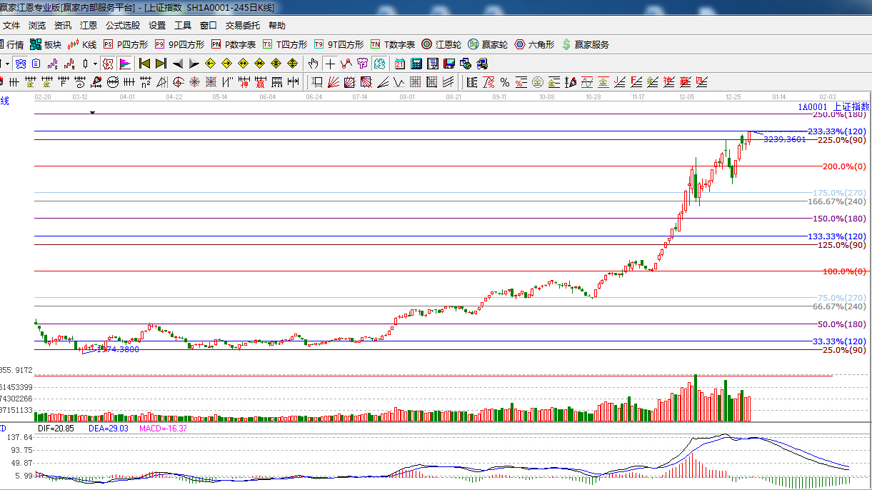 江恩看盤綜述:依據(jù)贏家江恩技術(shù)工具分析得出:2014年收官之日,金融、地產(chǎn)等權(quán)重股齊拉升,日K線圍繞江恩0度支撐震蕩兩天,再次走強(qiáng),90度支撐3186點(diǎn)此位置震蕩不破還有上升空間,操作上,藍(lán)籌股依然是炒作的主流,另外國資改革概念也可適當(dāng)逢低關(guān)注。
