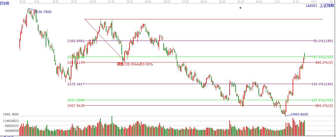 ★ 依據(jù)贏家波段百分比伸線提示:大盤突破315度位置壓力2270看多,這里將構(gòu)成一個重要的支撐位置,上方壓力2360附近180度位置。