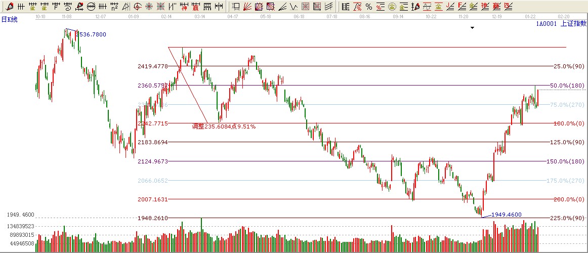 ★依據(jù)贏家波段百分比伸線提示:大盤270度位置長陽拉起,目標(biāo)壓力依然是180度位置2362附近,只有突破180度位置才會(huì)看高一線至90度位置。