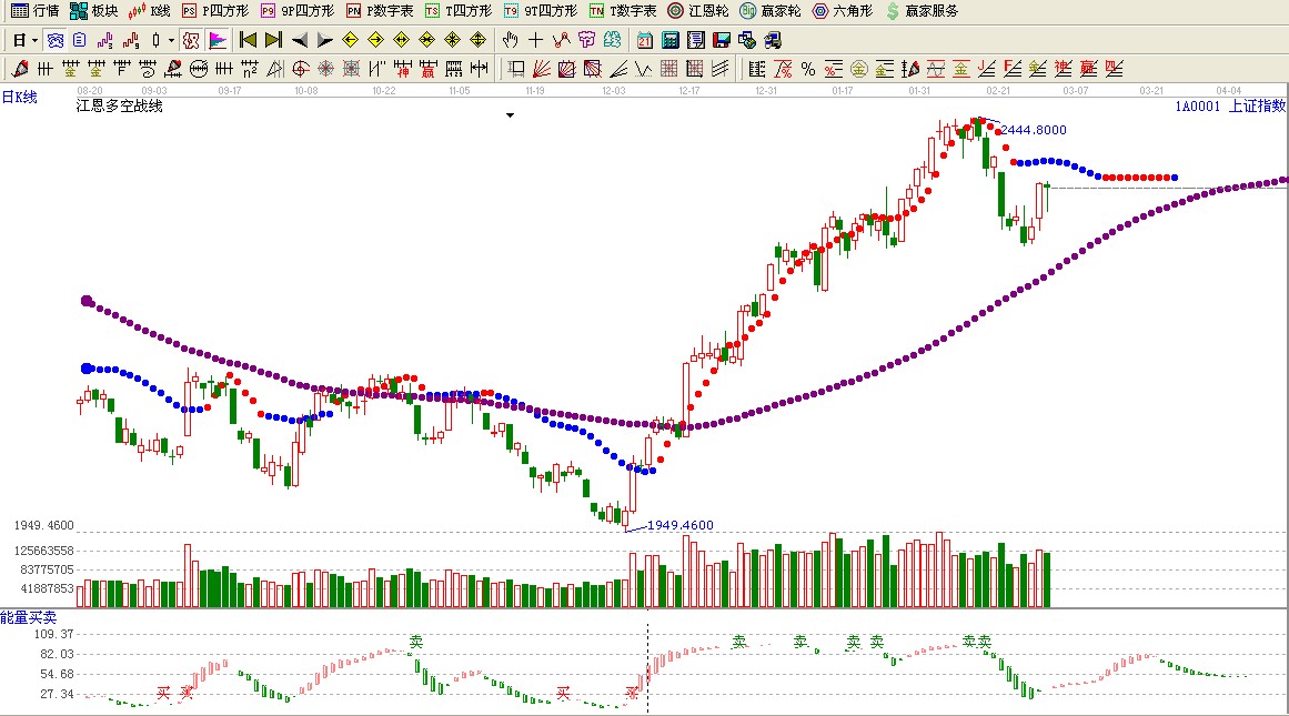 ★依據(jù)贏家江恩多空戰(zhàn)線提示:目前大盤(pán)運(yùn)行在長(zhǎng)期紫色多空線上方,短期藍(lán)色線上方,謹(jǐn)慎做多。