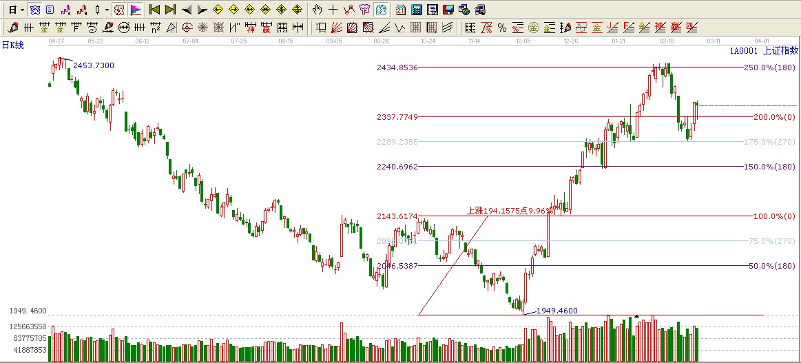 ★依據(jù)贏家波段百分比延伸線提示:目前大盤(pán)處于波段百分比延伸線200%(0)度位置2337點(diǎn)此位置不破看高至250%(180)度位置2434點(diǎn)附近。
