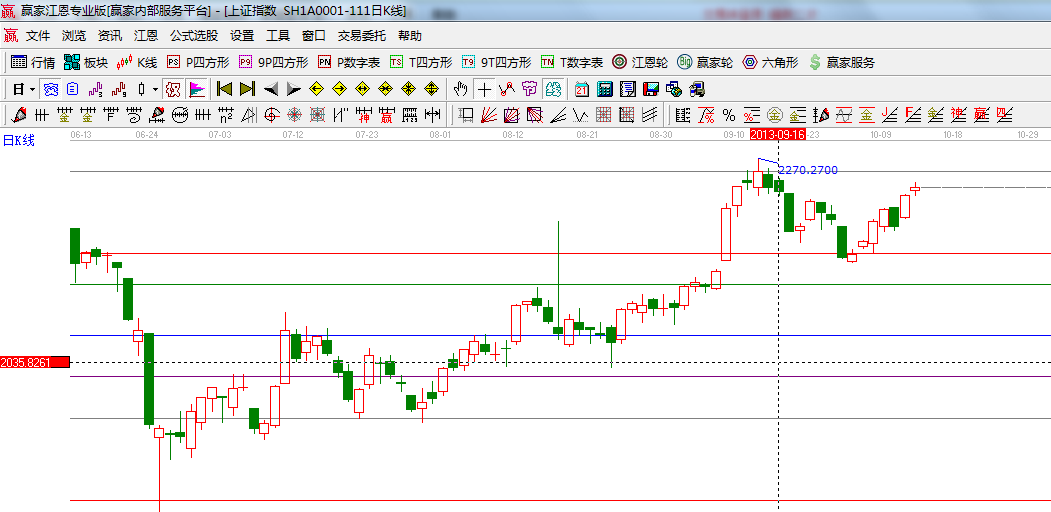 ☆依據(jù)贏家江恩系統(tǒng)波段百分比延伸提示:240-270度位置是2232-2255;