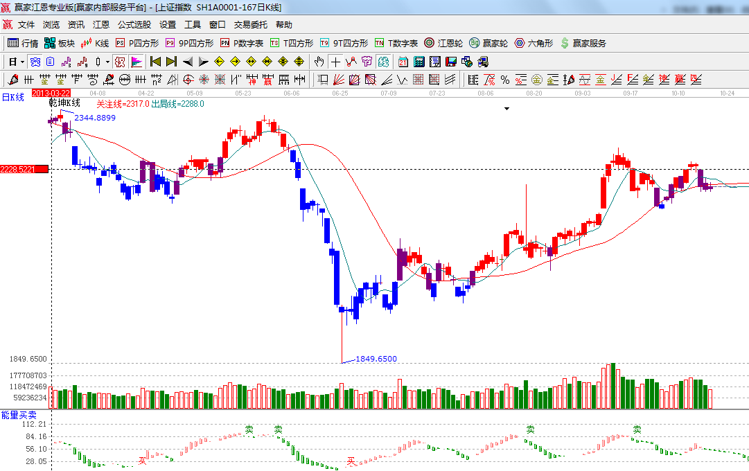 ★依據(jù)贏家江恩系統(tǒng)能量買(mǎi)賣(mài)提示:紅色柱子變成綠色,空方占據(jù)優(yōu)勢(shì);