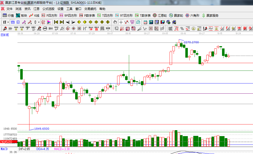 ★依據(jù)贏家江恩系統(tǒng)乾坤K線(xiàn)提示: 連續(xù)三天的紫色K線(xiàn)警示信號(hào),等待市場(chǎng)方向的選擇;