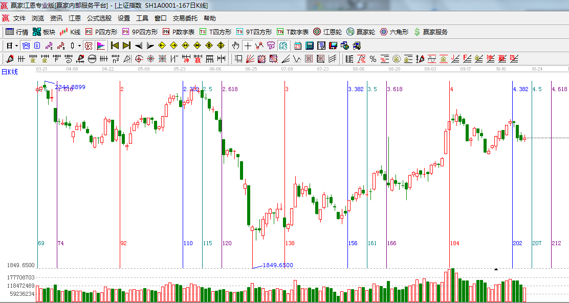 ☆依據(jù)贏家江恩系統(tǒng)波段百分比延伸提示:零度位置2160是下方百分比線(xiàn);