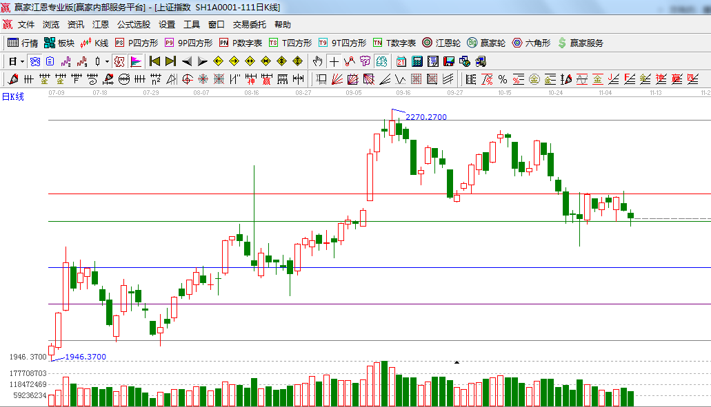 ★依據(jù)贏家江恩系統(tǒng)波段百分比延伸提示:江恩理論百分比45度位置是2125點,江恩百分比0度是2160;