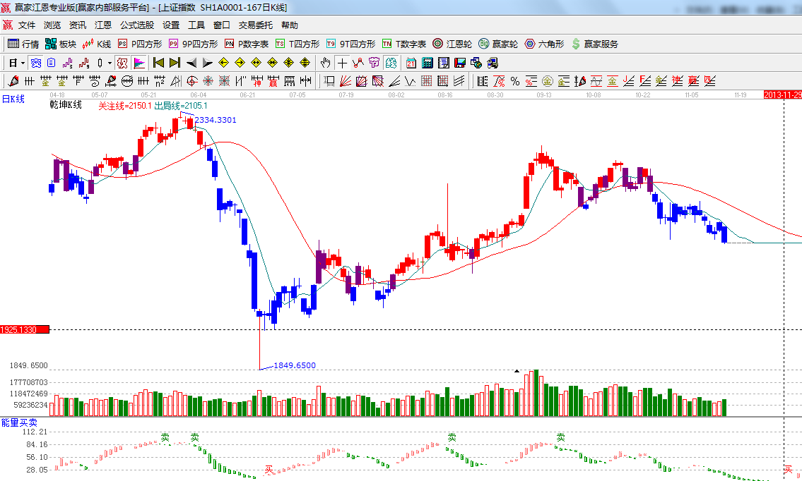 ☆依據贏家江恩系統能量買賣提示:綠色柱子空方占優(yōu)看空;