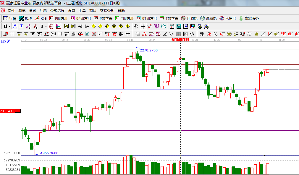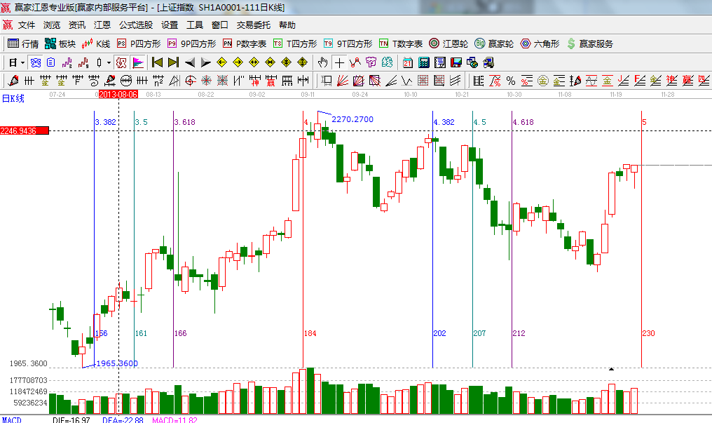 ☆依據(jù)贏家江恩系統(tǒng)波段百分比延伸提示:黃金分割價(jià)格圖0.236位置是2219點(diǎn),0.382位置是2050點(diǎn);