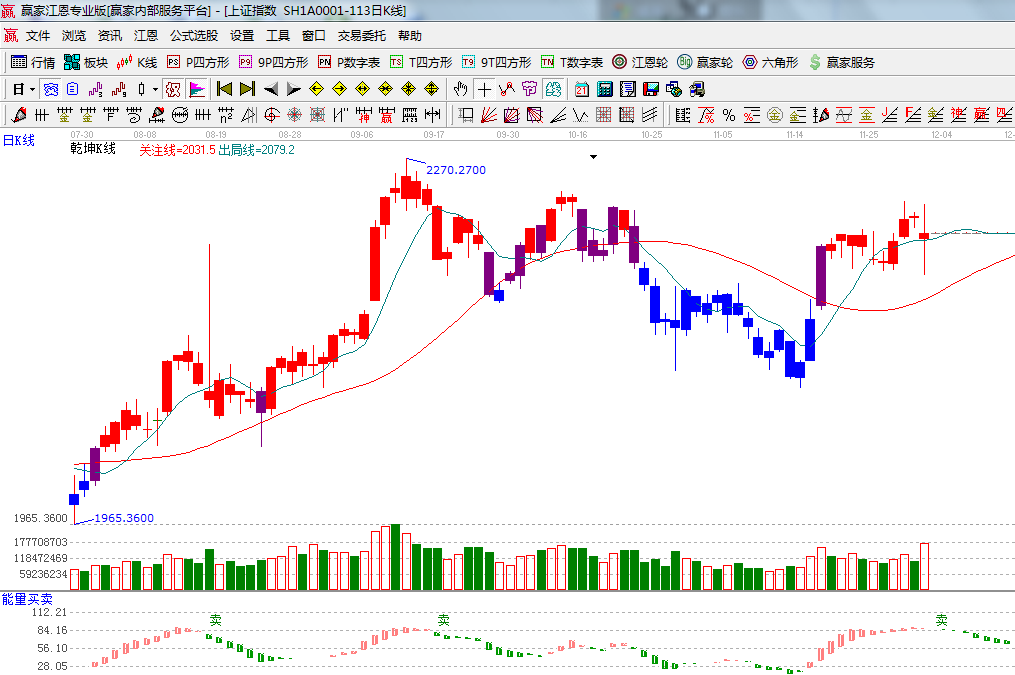 ☆依據贏家江恩系統(tǒng)能量買賣提示:多方量能紅色柱子縮短,出現賣出信號看空;
