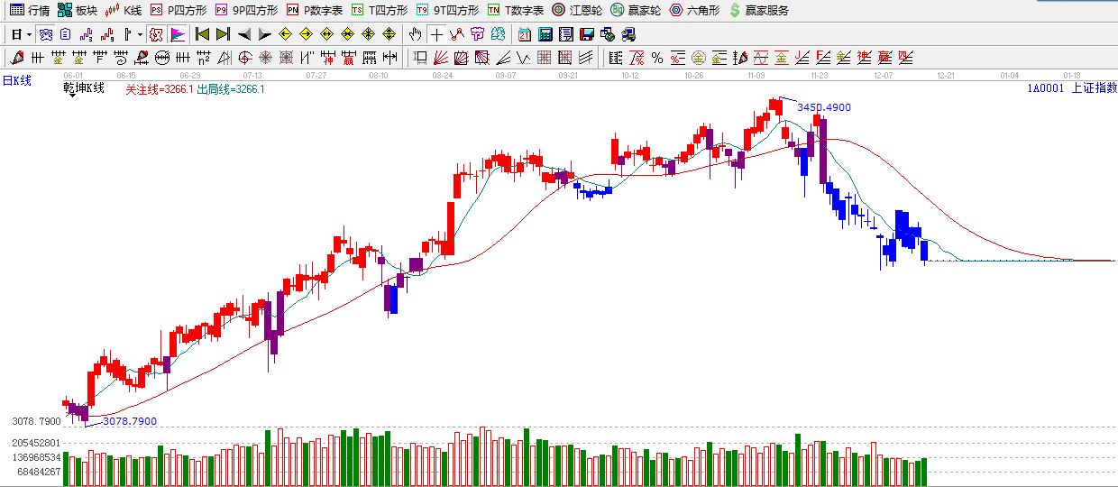☆依據(jù)贏家江恩理論系統(tǒng)乾坤K線提示:紅色關注線之下,k線處于藍色休息區(qū),依據(jù)規(guī)則,趨勢弱勢,空頭區(qū)域。