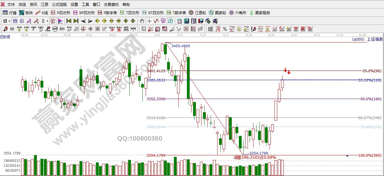 江恩看盤(pán)綜述:依據(jù)贏家江恩技術(shù)工具分析得出:周四,指數(shù)再創(chuàng)近期反彈新高,但市場(chǎng)展開(kāi)分化,在“兩桶油”的強(qiáng)拉升下,指數(shù)也呈現(xiàn)上漲乏力跡象。依據(jù)百分比分析,指數(shù)連續(xù)上攻已經(jīng)接近前期套牢區(qū),點(diǎn)位在3385--3400區(qū)間(百分比120度--90度之間),預(yù)計(jì)短期指數(shù)或?qū)_高回落,結(jié)束短期反彈走勢(shì),回調(diào)空間需要關(guān)注其力度和市場(chǎng)承接性,支撐關(guān)注日線生命線3345點(diǎn)附近。所以,不建議再次追進(jìn),同時(shí)逢高適當(dāng)減倉(cāng)下等待回落低吸良機(jī)。