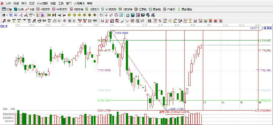 江恩看盤綜述:依據(jù)贏家江恩技術工具分析得出:周二,滬指在3400點之上整理,繼續(xù)保持強勢勢頭,但量能明顯縮小。在1月10日短線窗口臨近之際,縮量上行下短期將迎來調整,盤中支撐重點關注90度3401點。阻力位江恩45度線3425點附近,操作上,建議短線切勿盲目追漲,逢高減持降低倉位為主,個股上繼續(xù)關注成長性良好的超跌股以及年報預增的標的。