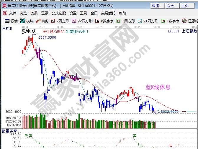 ☆依據(jù)贏家江恩理論系統(tǒng)乾坤K線提示:藍(lán)色K線代表波段休息,收盤價(jià)在短期出局線下運(yùn)行,短線、波段看空。