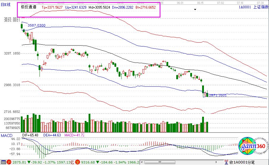 滬指跌1.37%,報收2875點;深成指跌1.94%,報收9316點;創(chuàng)業(yè)板跌2.69%,報收1521點。盤面上看,煤炭、鋼鐵、酒店餐飲等少數板塊上漲;集成電路、芯片、半導體、5G、網絡安全、人臉識別等板塊跌幅居前。全天,滬股通凈流入4.2億元,深股通凈流出12億。相應的極反通道指標的支撐壓力提示,如下圖所示: