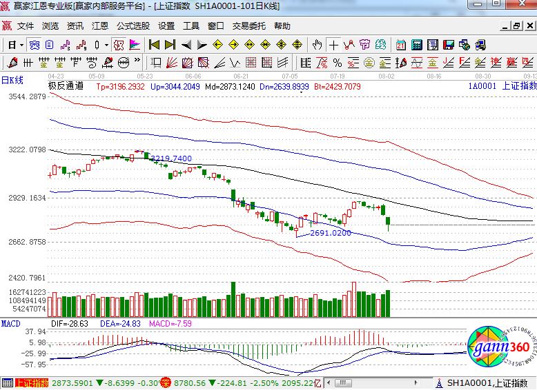 截止收盤,滬指跌2.00%,報2768點(diǎn);深成指跌2.50%,報8780點(diǎn);創(chuàng)業(yè)板指跌2.06%,報1510點(diǎn)。盤面上看,水泥、新疆、西藏、鋼鐵、農(nóng)業(yè)等少數(shù)板塊上漲;深圳國資改革、軍工、環(huán)保工程、電子競技、互聯(lián)網(wǎng)彩票、美麗中國等板塊跌幅居前。滬股通凈流入8.9億,深股通凈流出2億。相應(yīng)的極反通道指標(biāo)的支撐壓力提示,如下圖所示: