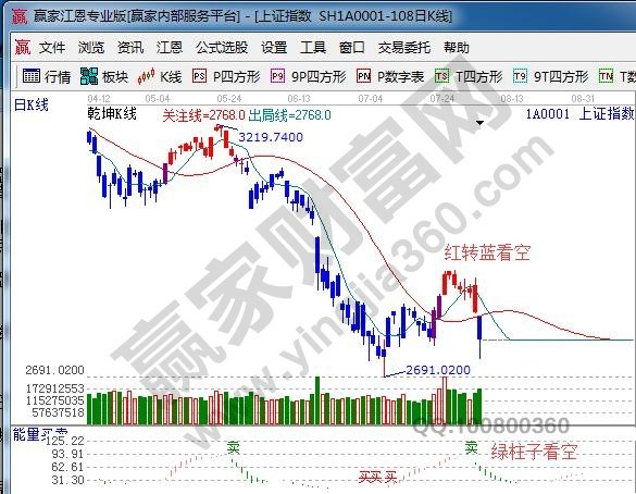 ☆依據(jù)贏家江恩理論系統(tǒng)乾坤K線提示:日線K線顏色紅轉(zhuǎn)藍波段看空,收盤在紅色關(guān)注下線,短線、波段做空。