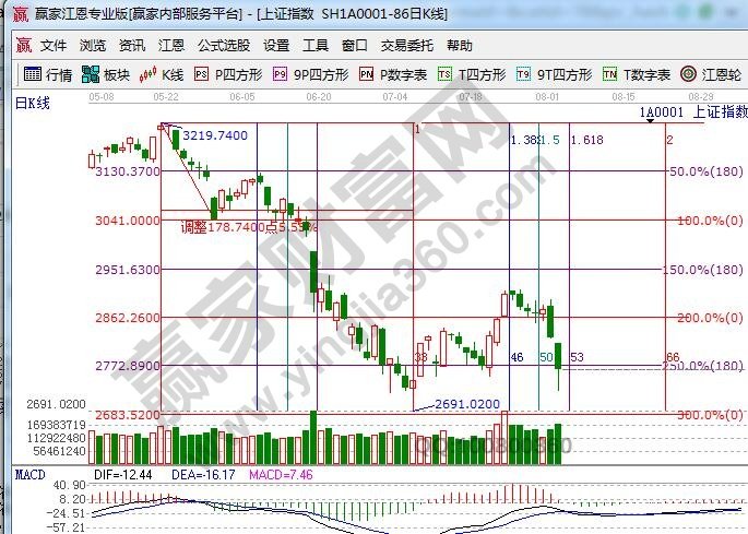 ☆依據(jù)贏家江恩理論系統(tǒng)極反通道提示:滬指暴跌中短周期15、30、60分鐘極反通道于午盤出現(xiàn)時價共振,跌幅收窄,短期反攻看5分鐘生命線2772及外軌線2790附近,日線按規(guī)則向藍色下軌線尋找支撐。