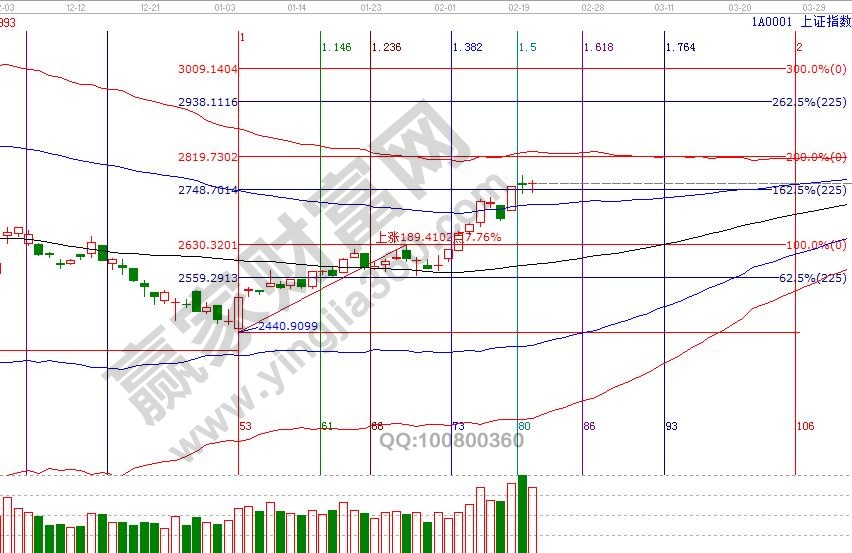 大盤(pán)延續(xù)在極反通道超強(qiáng)通道內(nèi)運(yùn)行,從時(shí)間周期和空間循環(huán)綜合看,市場(chǎng)向上運(yùn)行動(dòng)作還將延續(xù),距離紅色上軌線(xiàn)2822空間有60點(diǎn),結(jié)合短周期分析走勢(shì)會(huì)比較曲折??臻g點(diǎn)位,江恩百分比、江恩四方形顯示,21號(hào)支撐是2747、2730點(diǎn),2775、2778點(diǎn)是壓力,時(shí)間窗口是28號(hào)。操作策略,大盤(pán)日K線(xiàn)從強(qiáng)勢(shì)通道進(jìn)入超強(qiáng)通道,個(gè)股波動(dòng)空間增大,分批高拋藍(lán)色上軌線(xiàn)或紅色外軌線(xiàn)壓力個(gè)股,倉(cāng)位切換至生命線(xiàn)附近有量能配合的個(gè)股,整體倉(cāng)位保持在5-6成。