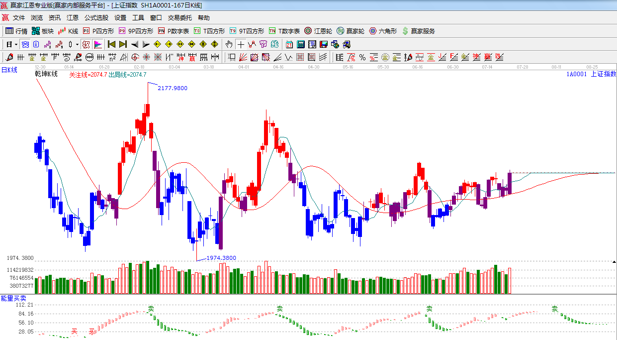 ★依據(jù)贏家江恩系統(tǒng)乾坤K線提示: 關(guān)注線位置拉起中陽線,紫色k線,警示信號,謹(jǐn)慎為主。