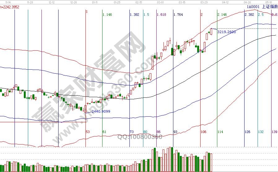 大盤日K線不斷刷新近期高點(diǎn),極反通道紅色外軌線是3250附近,站穩(wěn)一線看高一線規(guī)則,此線是確認(rèn)藍(lán)線后反彈的目標(biāo)位;空間點(diǎn)位上,輪中輪、價格四方形提示,3196-3175為盤中支撐,3240-3254為盤中壓力,4月5號為日線時間窗口,考慮假期因素,時間窗口效應(yīng)會提前至4或推遲下周一8號。操作策略,日線再度進(jìn)入超強(qiáng)通道,穩(wěn)健者倉位保持在5成,激進(jìn)者倉位保持在7成,靠近紅色外軌線持倉遵守提高止賺位策略。