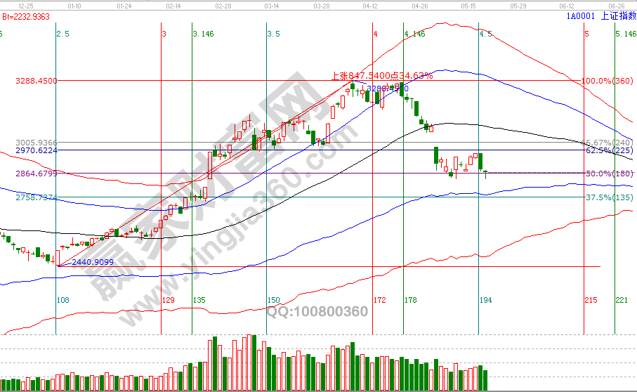 5月除9號至17號時(shí)間窗口有一次操作機(jī)會外,判斷的本月還會有一次布局機(jī)會,從空間波段百分比1倍循環(huán)二分位2834點(diǎn)與極反通道藍(lán)色下軌線(詳見工具)是參考區(qū)間,贏家江恩系統(tǒng)時(shí)間周期方面,本周短周期重要時(shí)間窗口是23號,日線時(shí)間窗口是28(29)號。通過系統(tǒng)工具預(yù)判方法得出參考空間與時(shí)間后,投資者要做的就是跟隨市場并做出應(yīng)對策略,并且預(yù)判此區(qū)間展開的反彈要強(qiáng)于第一波,具體空間與時(shí)間會在系統(tǒng)VIP學(xué)員公布。21號盤中壓力是90度2894點(diǎn)、135度2870點(diǎn),盤中支撐是315度2844點(diǎn)、270度2829點(diǎn)。操作策略,指數(shù)擊破黑色生命線進(jìn)入弱勢區(qū)域,高風(fēng)險(xiǎn)者倉3成,低風(fēng)險(xiǎn)者本周進(jìn)入備戰(zhàn)等待信號。