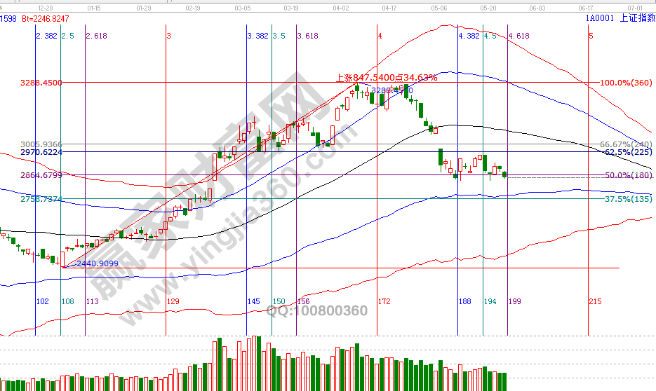 時(shí)間是決定市場(chǎng)走勢(shì)最重要因素?;仡欄A家江恩系統(tǒng)工具點(diǎn)評(píng)時(shí)間窗口,4月22號(hào)指出降低倉(cāng)位至3成,4月25號(hào)提示低風(fēng)險(xiǎn)者空倉(cāng)休息,5月9號(hào)時(shí)間窗口提示短線(xiàn)高風(fēng)險(xiǎn)可以開(kāi)倉(cāng),17號(hào)時(shí)間窗口前(15、16號(hào))提示獲利出局,這兩天提示短線(xiàn)周期時(shí)間窗口(23號(hào))將確認(rèn)一關(guān)鍵位,從收盤(pán)數(shù)據(jù)看,市場(chǎng)明日失守波段百分比180度2834點(diǎn),價(jià)格拐點(diǎn)將是5月第三個(gè)日線(xiàn)時(shí)間窗口28、29號(hào),在此時(shí)間段,無(wú)技術(shù)、無(wú)紀(jì)律者休息不要再被收割了,你是否將1季度的收益已回吐市場(chǎng)?要改變虧損的現(xiàn)狀,從擁有一套完整交易體系開(kāi)始。江恩理論研究時(shí)空運(yùn)行,通過(guò)工具預(yù)判出時(shí)間后,空間上則看趨勢(shì)工具極反通道藍(lán)色下軌線(xiàn)(VIP學(xué)員查看相應(yīng)位置)。日線(xiàn)藍(lán)色下軌線(xiàn)站穩(wěn)將是又一次操作機(jī)會(huì),待整固結(jié)束后市場(chǎng)必會(huì)有一波反彈到生命線(xiàn)行情,而這機(jī)會(huì)是留給有準(zhǔn)備的交易者。24號(hào)盤(pán)中壓力是315度2844點(diǎn)、0度2860點(diǎn),盤(pán)中支撐是225度2815、180度2800點(diǎn)。操作策略,指數(shù)擊破黑色生命線(xiàn)進(jìn)入弱勢(shì)區(qū)域,高風(fēng)險(xiǎn)者倉(cāng)3-4成,低風(fēng)險(xiǎn)者本周進(jìn)入備戰(zhàn)期。