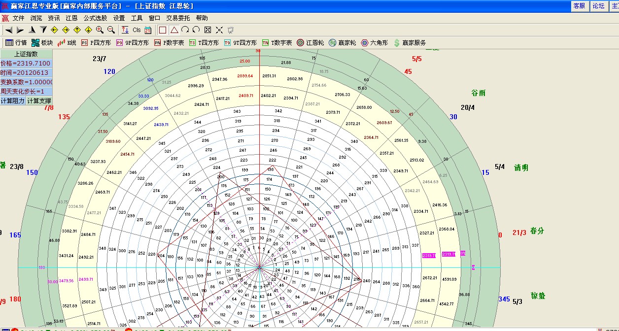 點擊贏家江恩系統(tǒng)工具欄上“江恩輪”圖形,打開如下圖,自外向內(nèi)依次是:24節(jié)氣、幾何角、角度、價位、十五個循環(huán)內(nèi)圈;