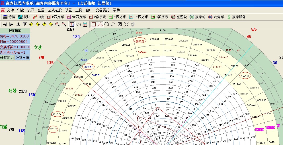 用鼠標(biāo)點(diǎn)擊3478點(diǎn),屏幕上方會(huì)有一個(gè)小三角說(shuō)明我們選中該點(diǎn)位,然后鼠標(biāo)點(diǎn)擊工具欄中江恩輪圖形打開(kāi)如下圖,變換系統(tǒng)使用默認(rèn)的1,周天變化步長(zhǎng)默認(rèn)1,最后點(diǎn)擊計(jì)算支撐,我們發(fā)現(xiàn)歷史上重要的點(diǎn)位如3186、2610、2319等點(diǎn)位都在輪子上面得到提現(xiàn),3186是30度位置、2610是90度位置,2319為120度,依此來(lái)推算當(dāng)下大盤(pán)支撐是150度的2028點(diǎn),此點(diǎn)位與江恩箱,黃金分割、極反通道等分析工具得出點(diǎn)位基本一至,需要投資者重點(diǎn)關(guān)注此區(qū)域得失。