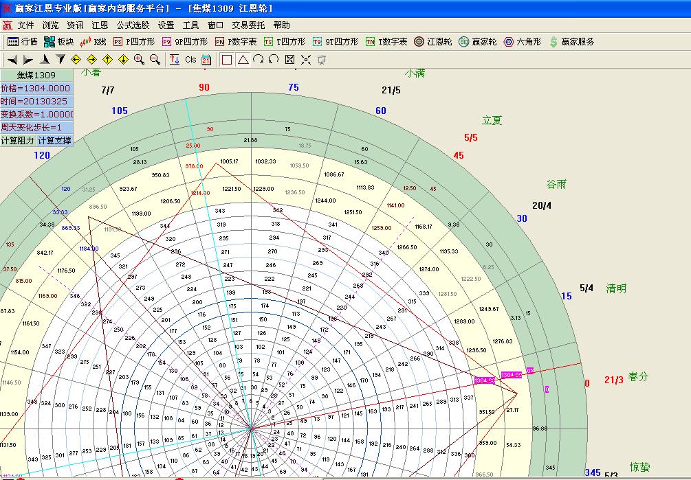 在2013-04-15 曾經(jīng)寫過一篇帖子:解讀江恩9格價格正方;帖子里面對其江恩九格價格正方形焦炭1309合約做了詳細分析:我們回過頭發(fā)現(xiàn),焦炭1309合約確實按照江恩規(guī)則說的那樣:30點位置1195.34點來了一個9個點的反彈,因為低于9點的反彈,也就告訴大家這是一個弱勢的信號,也因此預(yù)示著更低的點位,也就是上次分析中指出的50點位置1122.90點。
