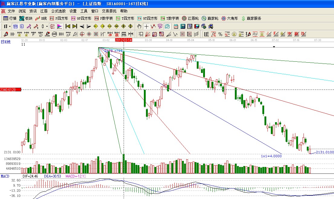咨詢:13333833889上節(jié)我們簡(jiǎn)單講解贏家江恩角度線畫(huà)法及公式,本節(jié)內(nèi)容主要介紹贏家江恩角度線用法,明白了角度線的制作原理,通過(guò)鼠標(biāo)單擊指標(biāo)可將角度線快速的畫(huà)出,線與線之間的關(guān)系我們進(jìn)一步講解;