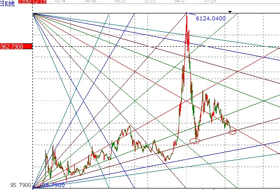 以上證指數(shù)開盤第一天的時間至目前已知的高點6124點為終點做圖,贏家江恩軟件用戶可點擊工具欄江恩箱圖標(biāo)制圖,以1990年12月19號最低點95.7為起點,2007年10月16號的最高點6124點為終點結(jié)果如下圖,圖形畫好后需要設(shè)置步長向后延伸,起點與終點共4125個交易日,安此交易日進(jìn)行倍數(shù)或黃金分割關(guān)系放大后得出下圖,歷史上已知的重要低點如1664在2*1角度線上,當(dāng)下大盤也運行至此線附近,需要投資者重點關(guān)注,與極反通道弱勢外軌線,江恩價格四方形多工具共振;
