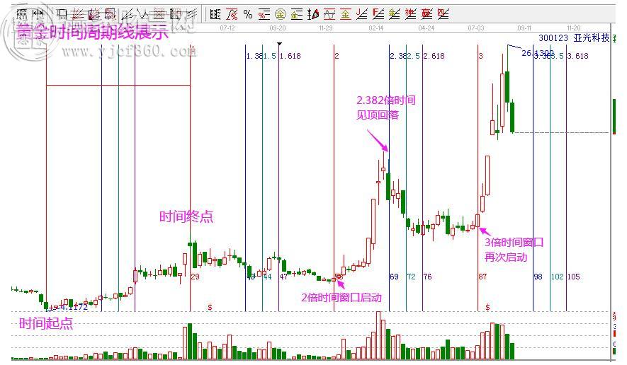 圖形解析:亞光科技,以2018年10月19日低點(diǎn)到2019年5月17日高點(diǎn)的周線為起始周期。同時(shí)保留最關(guān)鍵的0.382、0.5、0.618分割位。可以看到,股價(jià)在2倍時(shí)間窗口啟動(dòng)拉升,在2.382倍時(shí)間窗口拐點(diǎn)向下,3倍時(shí)間窗口再次啟動(dòng)趨勢拉升行情。兩波大幅度上漲行情,都是出現(xiàn)在倍數(shù)位,可通過該工具完美把握。因此,接下來的4倍時(shí)間窗口就尤其關(guān)鍵了。