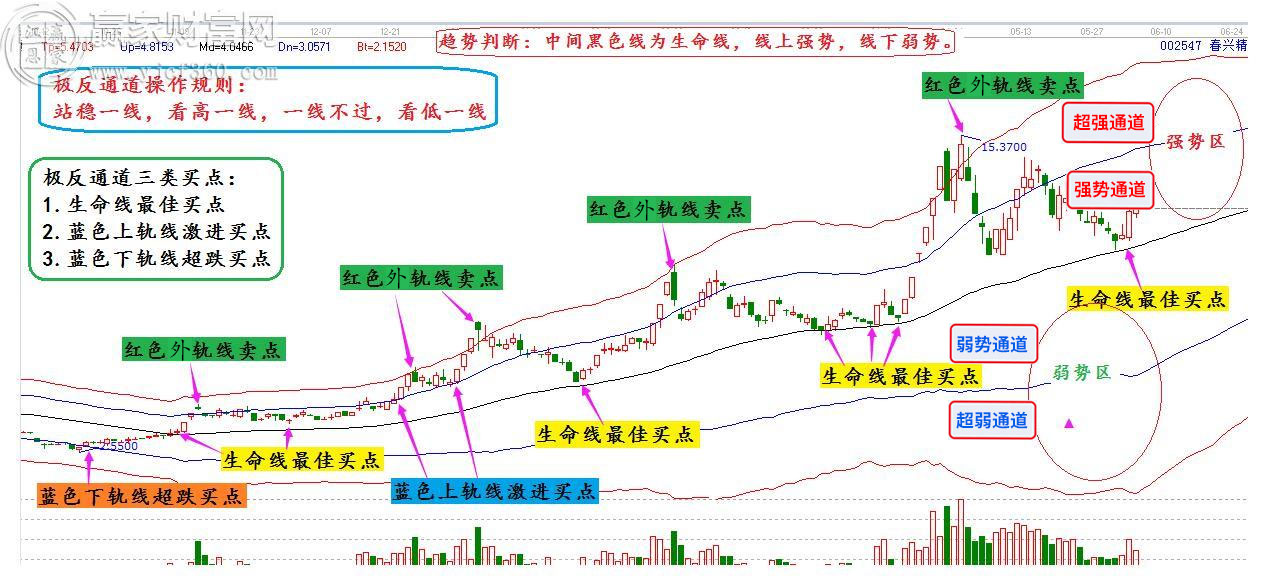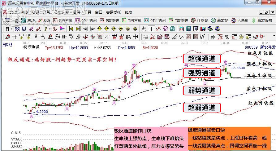 1.判斷趨勢:極反通道中間的黑色線,稱為生命線。依據(jù)股價與生命線的關(guān)系:股價在生命線以上,則股票強勢可以操作;股價在生命線以下,則股票弱勢暫不考慮。生命線是一個強勢股票的啟動點,所以贏家建議優(yōu)先考慮生命線附近的股票,有強勢股不做弱勢股。