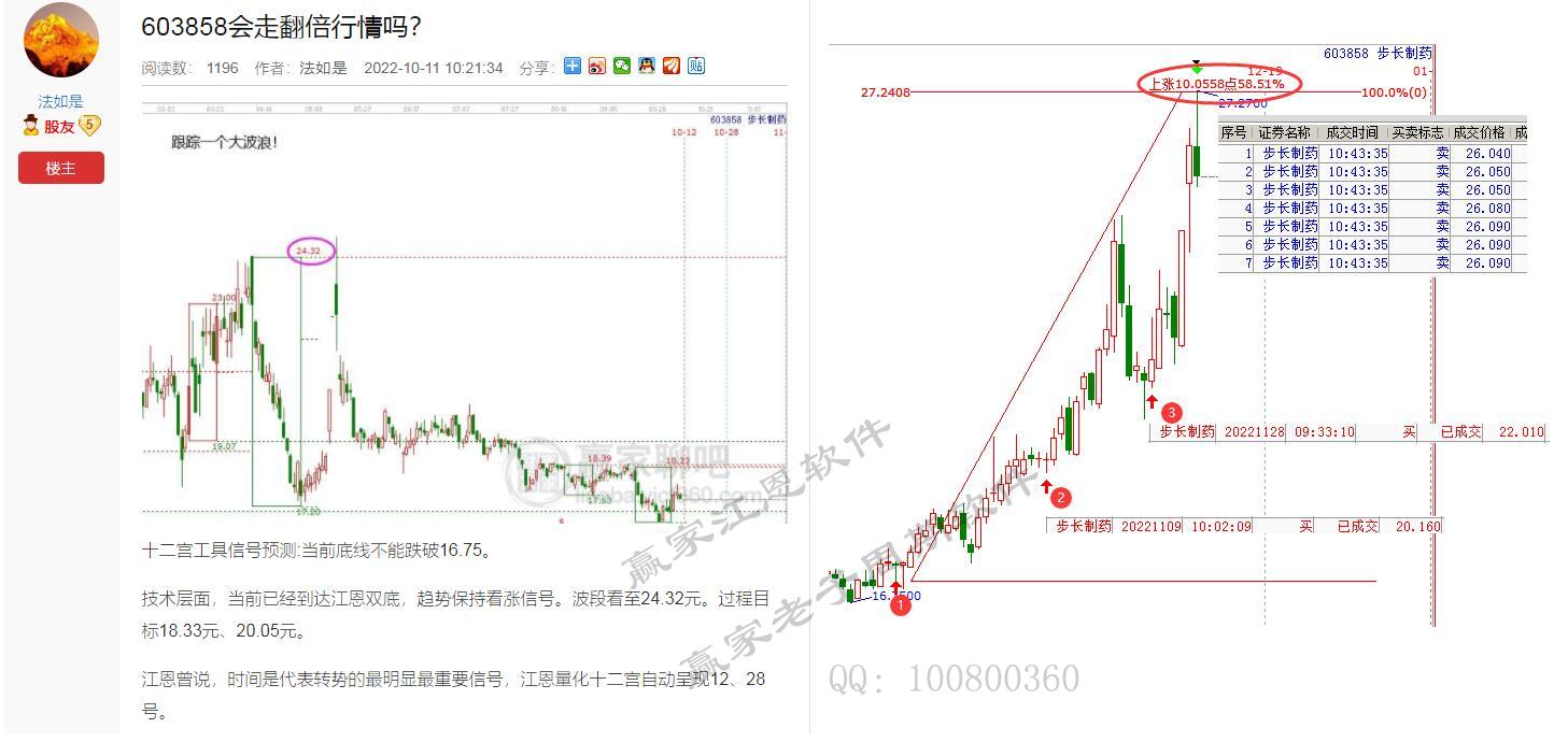 步長制藥22年10月11日選出,現(xiàn)價(jià)17.47元,運(yùn)用十二宮工具信號,預(yù)測空間目標(biāo)24元,于12月7日完成,即止盈!整個(gè)波段走下來,僅用41個(gè)交易日,收益在59%!