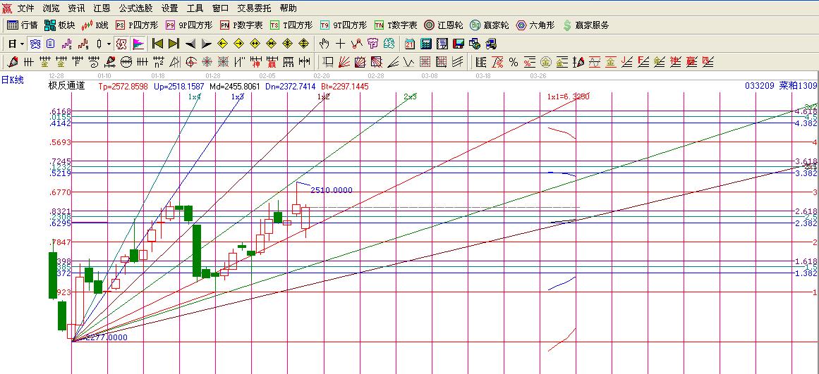 菜粕1309合約一直沿著角度線1*1線的位置穩(wěn)步上行未來(lái)也就是20130220日就是重要的時(shí)間拐點(diǎn)的位置,時(shí)間來(lái)臨前逢低做多為主。