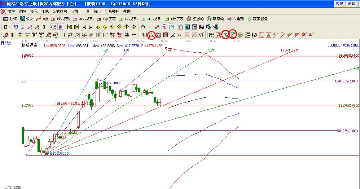 玻璃1282.00波動率為3.5611作圖角度線;1282低點作圖江恩價格百分比,然后在1282點的基礎45度位置做波段應用波段百分比延伸線制圖: