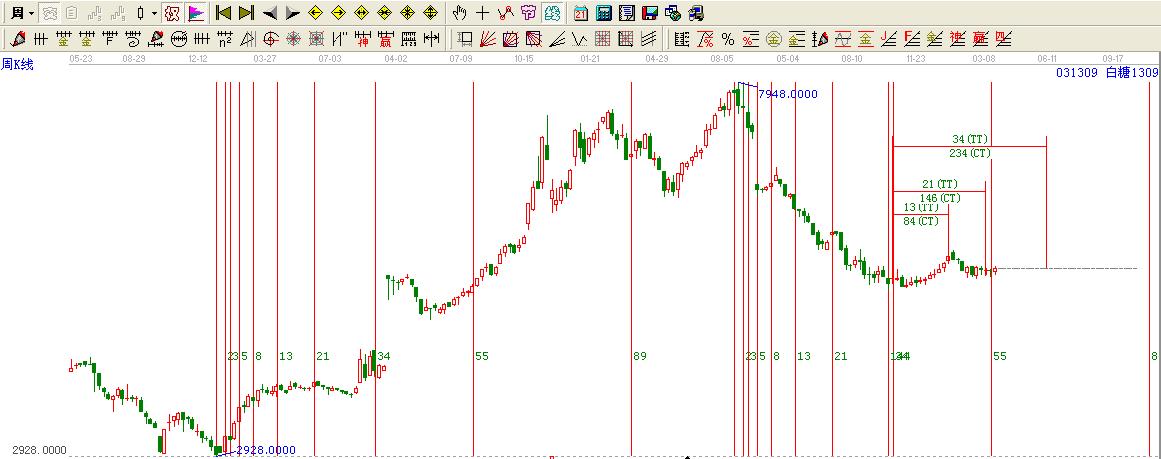 白糖1309合約7978下跌至5150以來(lái)后經(jīng)行了為期55周的下跌。55是斐波那契數(shù)列中的一個(gè)數(shù)字,而在其2012-09-28低點(diǎn)5150是其33周的下跌,僅僅誤差了1周。如果以2012-09-28低點(diǎn)5150為起點(diǎn),那么高點(diǎn)在其2013-03-11周提前一周,然后開啟了一個(gè)調(diào)整。目前也走過(guò)了21時(shí)間窗口。下一個(gè)時(shí)間窗口在其34時(shí)間周期。2702如果用心去研究你會(huì)發(fā)現(xiàn)更為奇異的事情,白糖1309合約周線2008-12-13日低點(diǎn)2928點(diǎn)到期7948高點(diǎn)來(lái)調(diào)整的時(shí)間144周剛好坐落于周2012-09-28低點(diǎn)5150白糖1309合約周線時(shí)間窗口變盤在即,日線級(jí)別也非常的巧妙:白糖1309至2012-09-26日低點(diǎn)2150以來(lái),每一次的低點(diǎn)都在不斷的抬高上方在其5480構(gòu)成了較為重要的壓力位置。