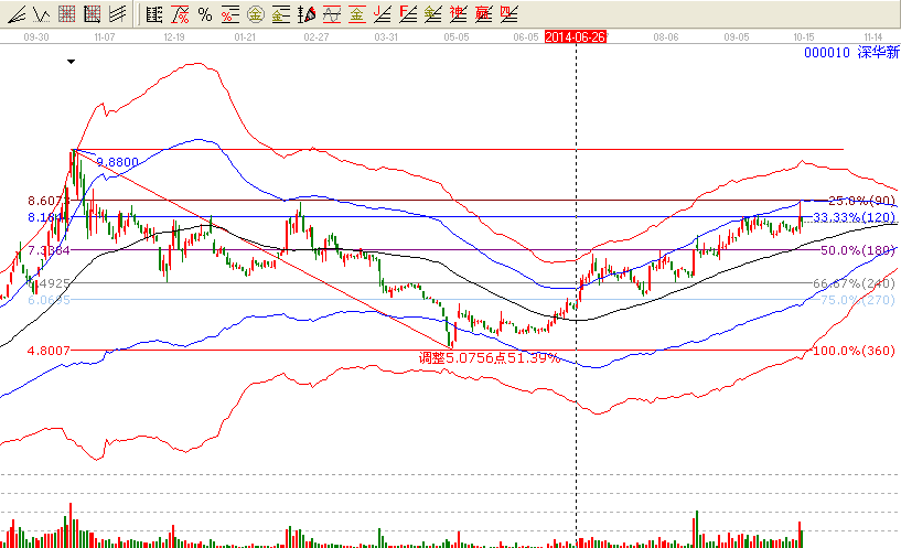 2技術(shù)分析:首先我們從江恩的極反通道來看,該股近期一直在生命線之上運(yùn)作,根據(jù)江恩軟件理論基礎(chǔ)生命線之上可操作行比較強(qiáng),給予關(guān)注。其次我們從江恩波段百分比來分析,該股從最高點(diǎn)延最低畫線真好符合波段百分比的標(biāo)準(zhǔn)圖形如下圖,下面我具體來分析這二個(gè)工具在這個(gè)股的運(yùn)用以及的出來的結(jié)論。