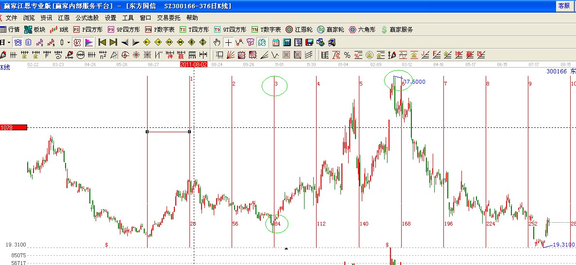 我們以創(chuàng)業(yè)板300166(東方國信)做分析,此股2011年6月20號創(chuàng)出階段性低點后展開60度左右的上攻,所用時間28天,漲幅31%,隨后轉(zhuǎn)為調(diào)整,然后整理的時間正好到84天,是原上漲周期的第3個循環(huán)的結(jié)束點上,然后股價再次上漲也正好用了三個循環(huán),這也整理時間的魅力;