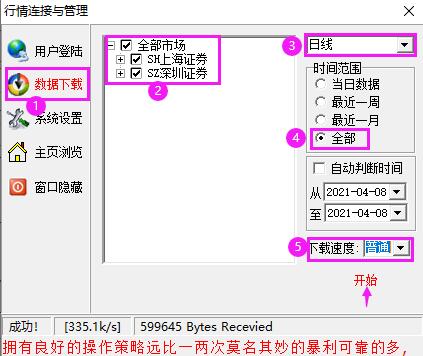 雙擊軟件右下角的燈塔圖標,打開【行情連接與管理】,點擊左側的【數(shù)據(jù)下載】,在【上海證券】和【深證證券】前面的方框打鉤選中,右上角的下載內(nèi)容選擇【日線】,時間范圍選擇【全部】,下載速度選擇【普通】,然后點擊【開始】,直至下載完畢。