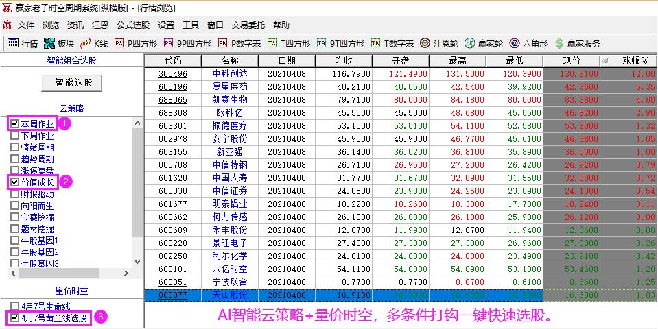 贏家江恩云策略智能選股功能,主要分為AI智能選股與技術選股兩大類型,以日線數(shù)據(jù)為選股基礎,多條件打鉤匹配,一鍵快速篩選優(yōu)質(zhì)個股。AI選股模型為贏家財富網(wǎng)數(shù)據(jù)倉庫+時間周期密碼+數(shù)學量化模型+行業(yè)深度研究+資金動向的智能選股平臺,底層邏輯均是依托時間周期密碼運行,目前贏家共推出十余種智能選股模型,詳見【贏家老子時間周期證券分析系統(tǒng)】介紹。技術選股主要將贏家多年實戰(zhàn)總結的選股模型編寫成選股指標,幫助投資者來篩選出符合條件的個股。軟件主要精選了4個選股器,分別為揚帆起航、強勢飛龍、股海擒龍和靈蛇之珠。先來了解下這4個選股器的設計原理及選出來的個股風格,方便用戶根據(jù)自己的操作需求選擇相應的選股器。